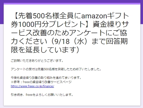 freeeの資金繰り関連サービス改善のためのアンケートのよう。