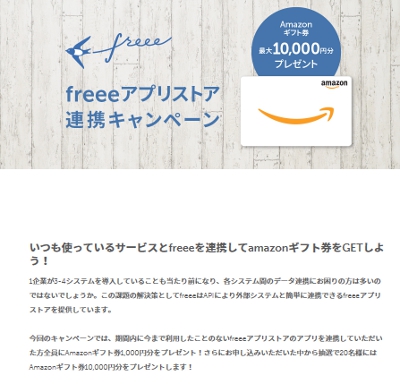 期間中に、これまで連携したことのないfreeeアプリストア掲載アプリと連携して応募すると、Amazonギフト券1,000円分をもらえるそうです!