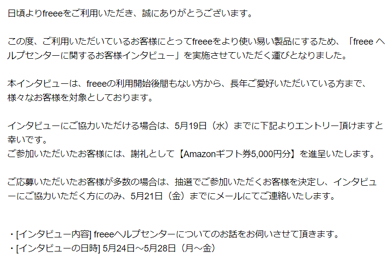 「freee ヘルプセンターに関するお客様インタビュー」を実施するのだそうです。