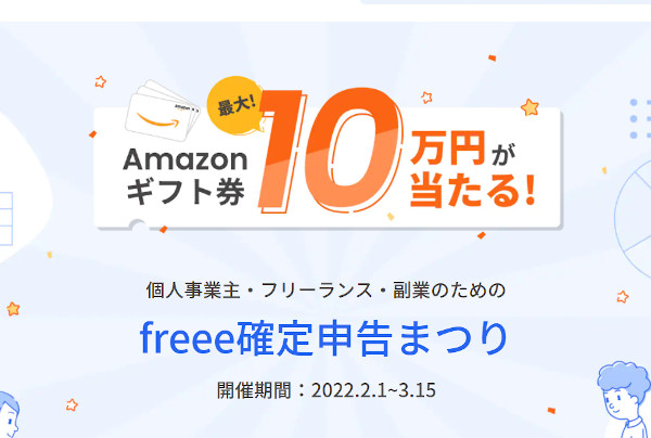 個人事業主向けに最大10万円のAmazonギフト券が当たる「freee確定申告まつりキャンペーン」をやっています。