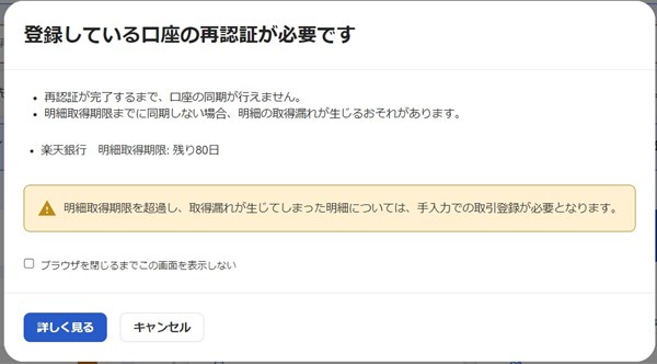 freeeにログインしたところ、口座再認証が必要な旨のポップアップが表示されました。