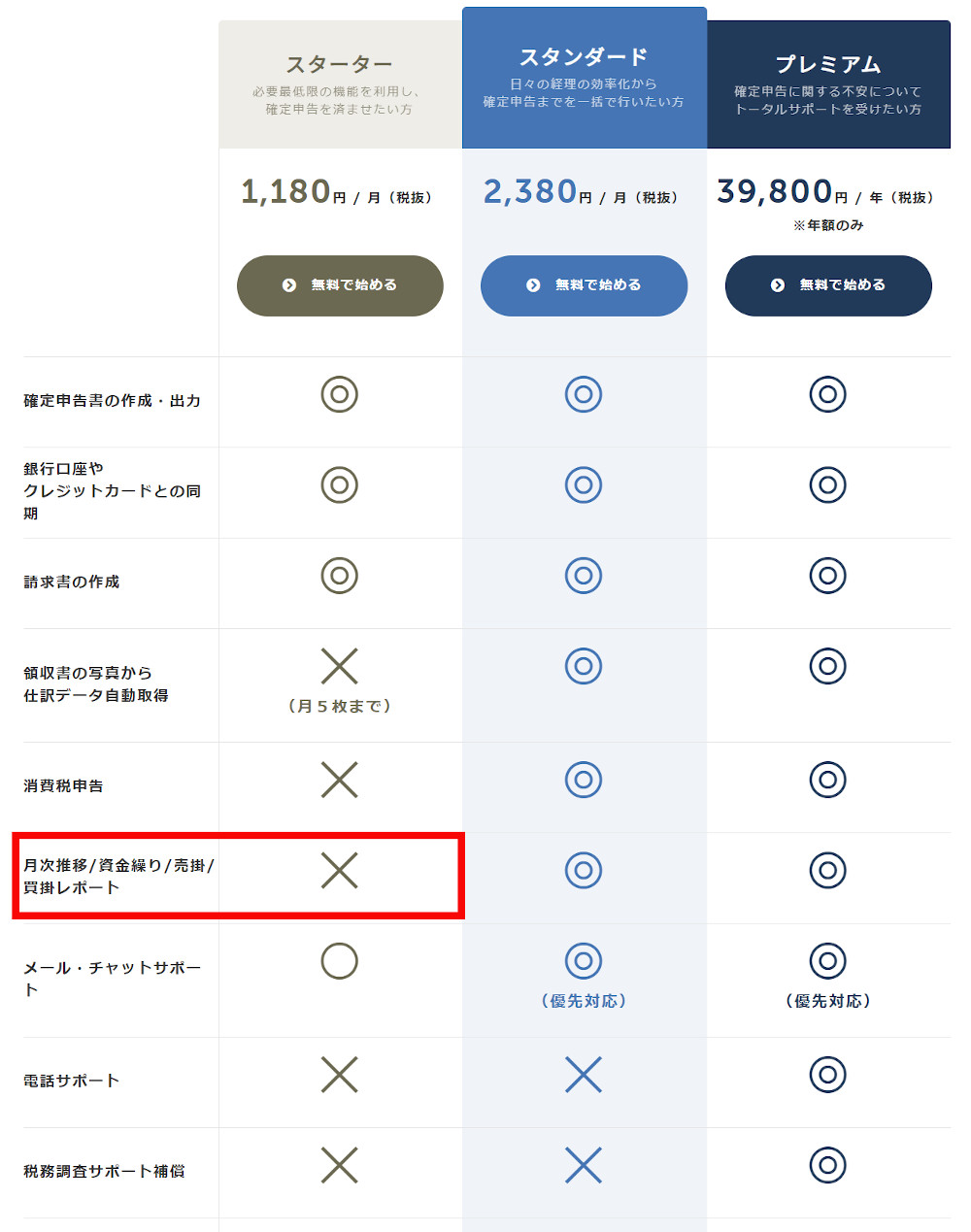 スタータープランだと、月次推移レポート(損益計算書・貸借対照表)を表示させる機能がありません。
